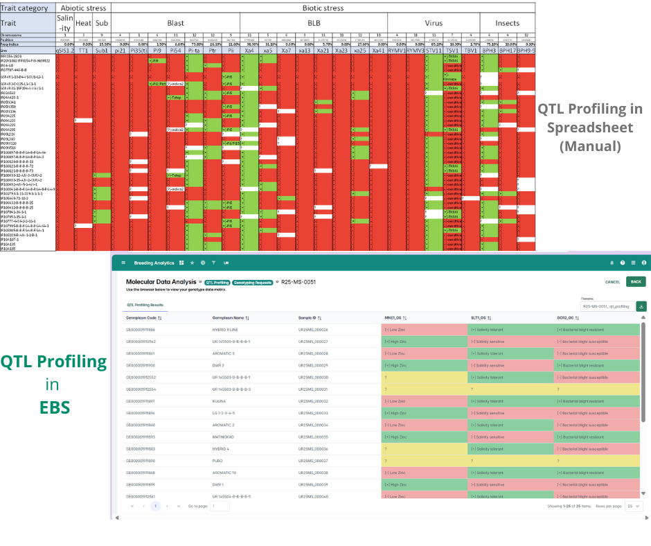 The Enterprise Breeding System (EBS), developed by CGIAR, is transforming how rice breeders utilize molecular data to enhance varieties. For years, EBS has been the trusted platform for managing breeding information, germplasm, and trial data. Today, it takes a step further: through QTL profiling, the system can now turn complex genotyping data into clear, actionable insights—faster and at scale.