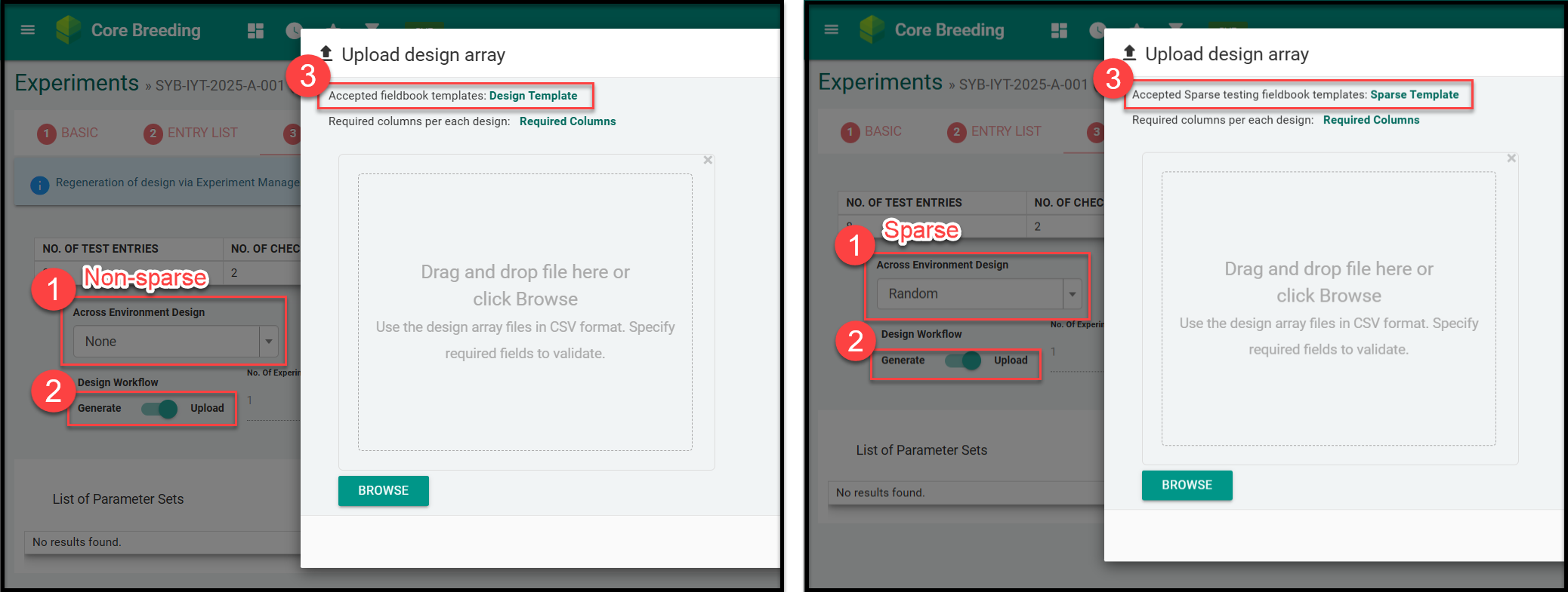 To prevent data validation errors, the design file template now has the Plot Code column instead of the Plot Number. The updated templates are available for both sparse and non-sparse testing in the new design interface.