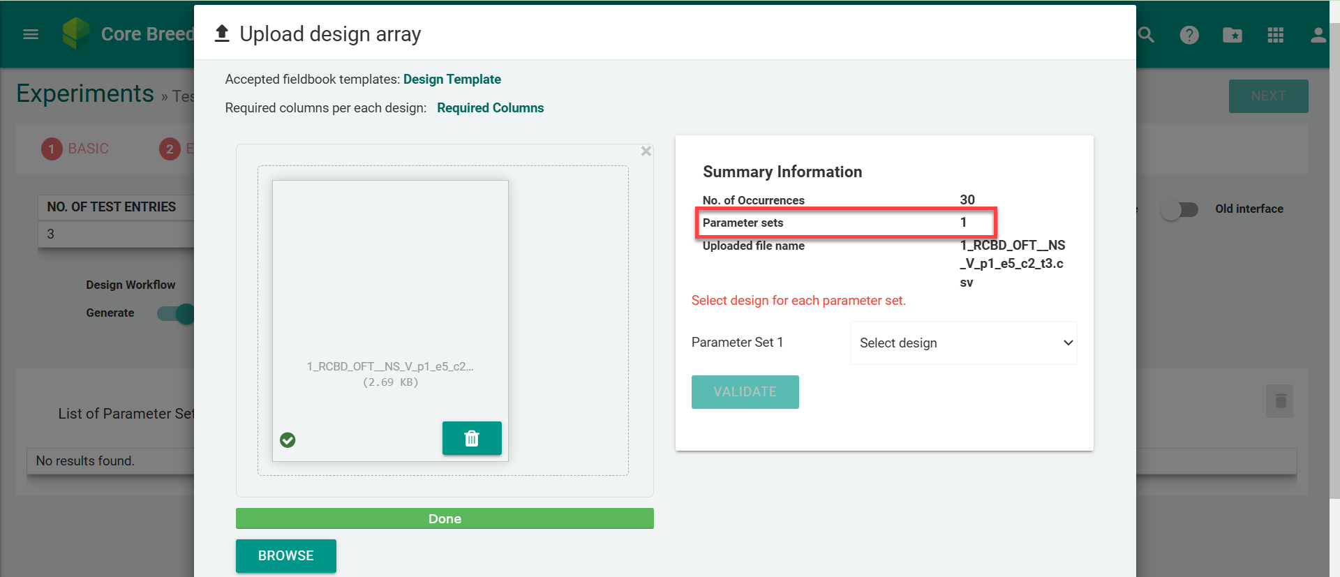 When uploading the design for Breeding Trial experiments using the OFT stage, users need to make sure that the Parameter Set column in their design file indicates only 1 parameter set. Otherwise, the validation will fail.