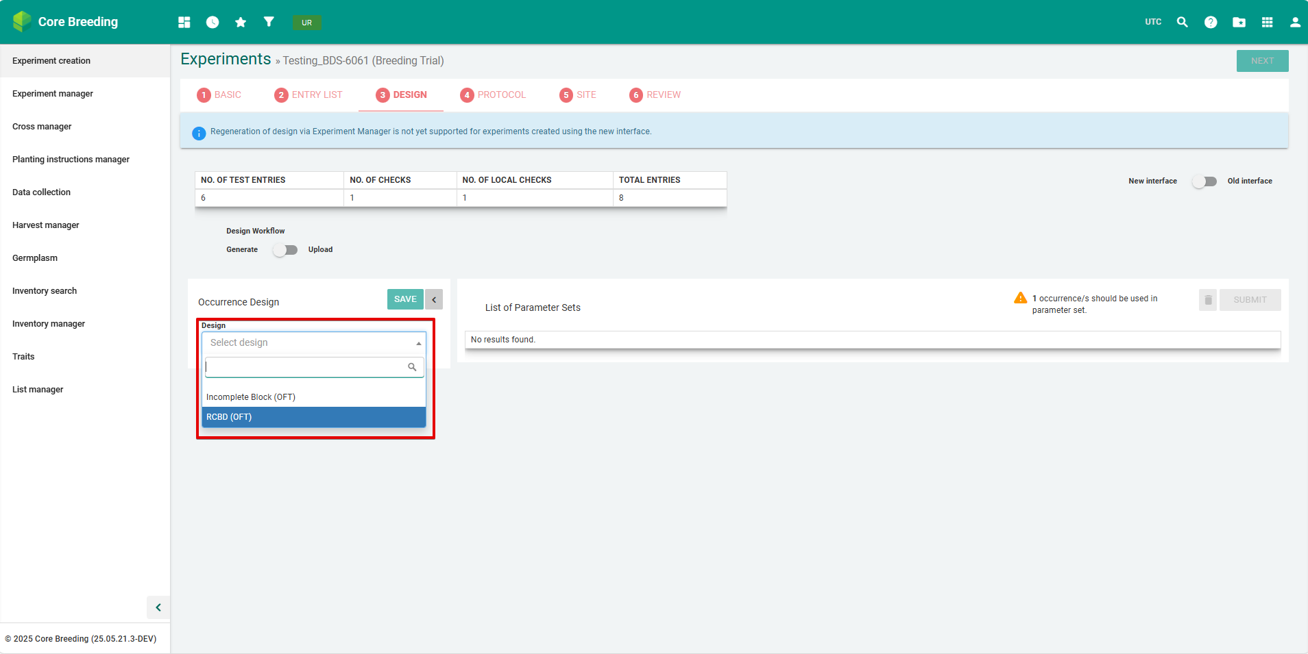 Users who create Breeding Trial experiments that use the OFT stage can now only generate trial designs that are OFT-supported. At Step 3: Design, the design dropdown menu will only display the Incomplete Block (OFT) and RCBD (OFT) designs for selection.