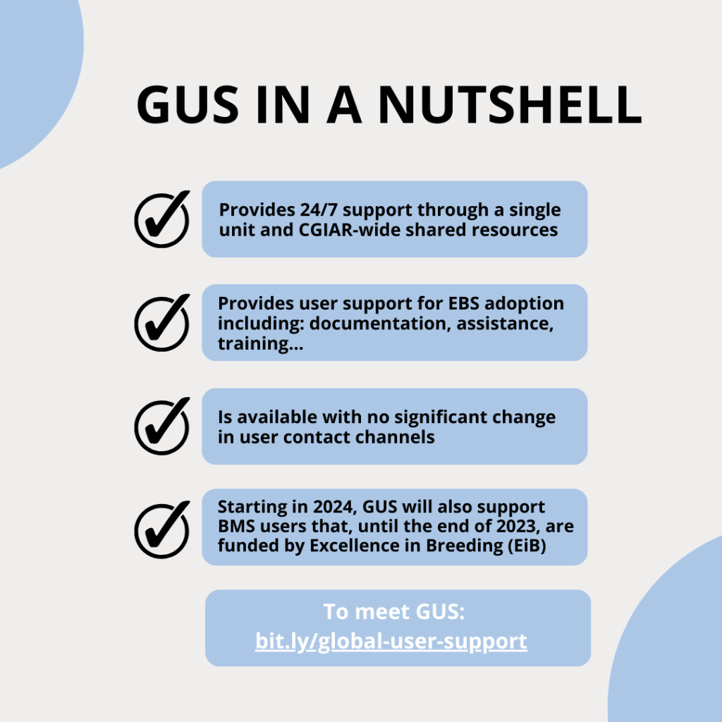 In this context and while continuing to support users adopting EBS, GUS is also expanding its services to encompass Centers and partners in the pipeline for EBS adoption. Starting in 2024, support will extend to Excellence in Breeding (EiB) funded CGIAR users of Breeding Management System (BMS). These BMS users will transition to EBS in the coming years through a carefully planned and managed process.