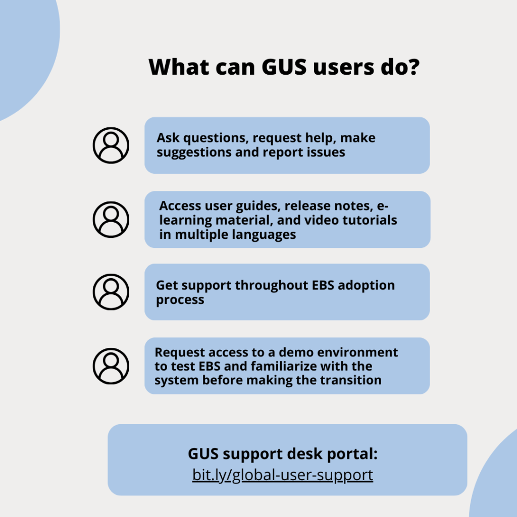 The EBS team is diligently preparing for this shift and the expansion of users. Building a global support function is paramount to ensure the quality and timeliness of EBS deployment. This will be made possible by streamlining processes, eliminating duplications in efforts, and working closely with local support teams to strengthen their capacity – all possible thanks to GUS.